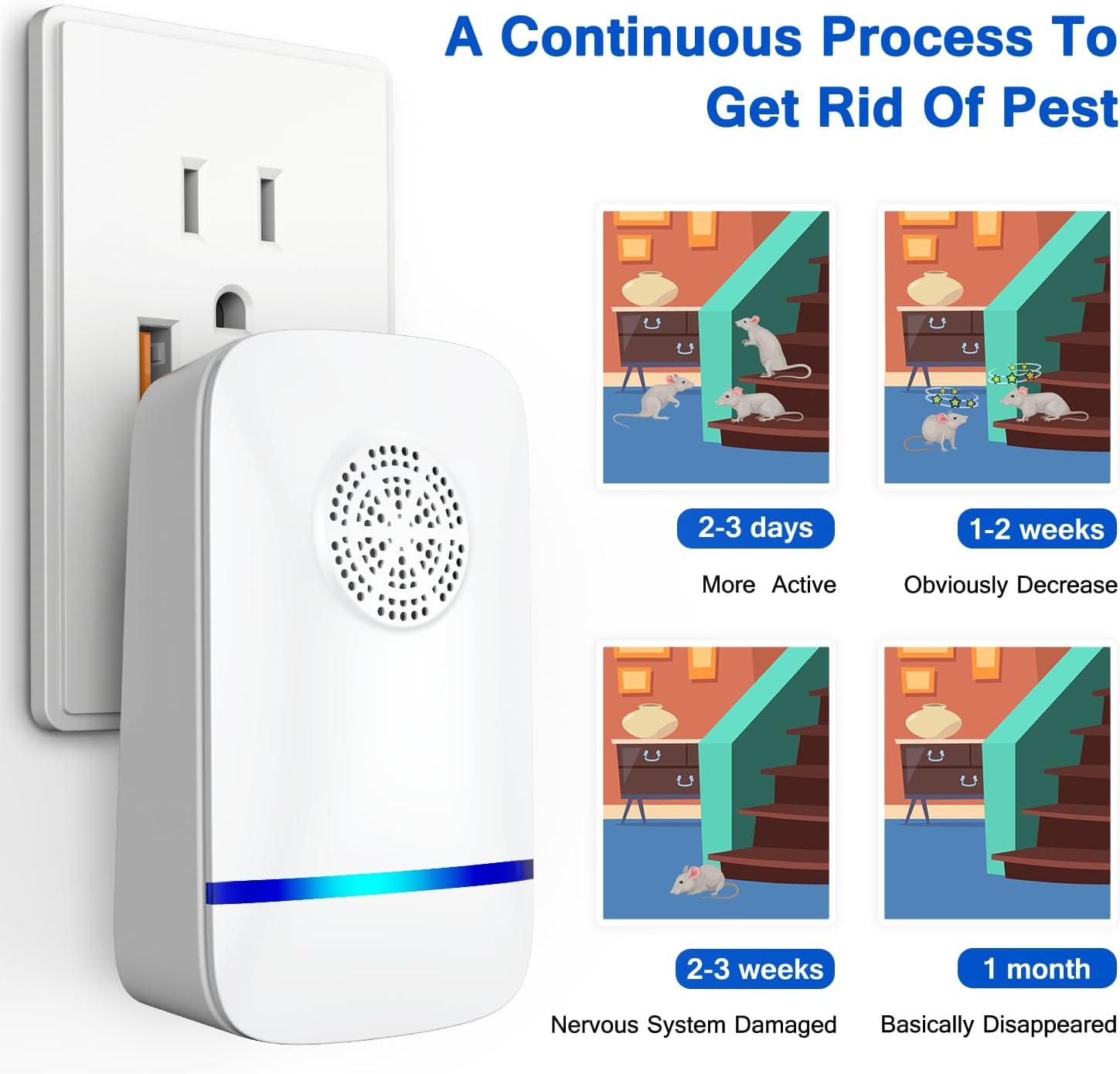 【Energy saving and reliable】Plug-in pest control device with low power consumption of only 3~5W, cost-effective and environmentally friendly. You can expect to see significant results in 1-2 weeks and even more significant improvements in 3-4 weeks. For ongoing protection against pests, including rodents and bats, continuous use is recommended, making it the best option for getting rid of rats and an effective ultrasonic bat repellent
